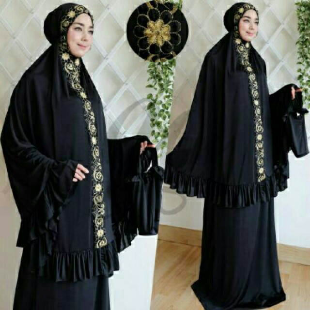 Mukena Raisa Black 153000 Bahan Jersey Sutra Motif Bordiran